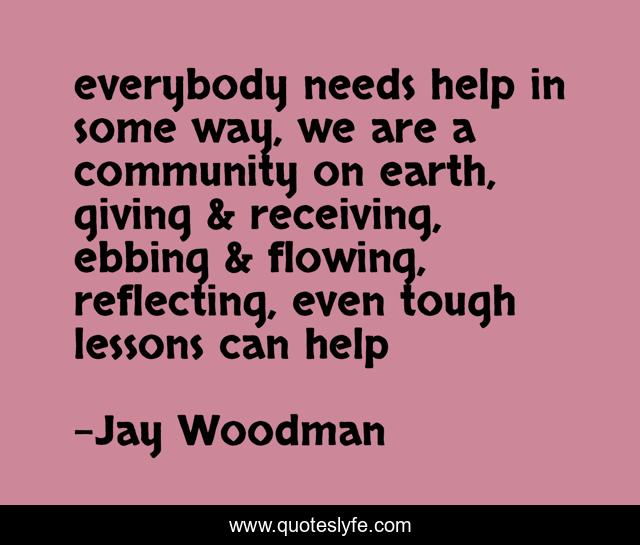 This page presents the quote "everybody needs help in some way, we are a community on earth, giving & receiving, ebbing & flowing, reflecting, even tough lessons can help". Author of this quote is Jay Woodman. This quote is about giving, lessons, need, receiving, help,.