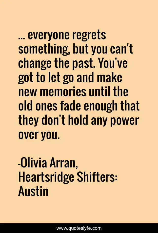 This page presents the quote "... everyone regrets something, but you can't change the past. You've got to let go and make new memories until the old ones fade enough that they don't hold any power over you.". Author of this quote is Olivia Arran, Heartsridge Shifters: Austin. This quote is about pain, regret, memories, inspirational, enthusiasm, love, affection,.