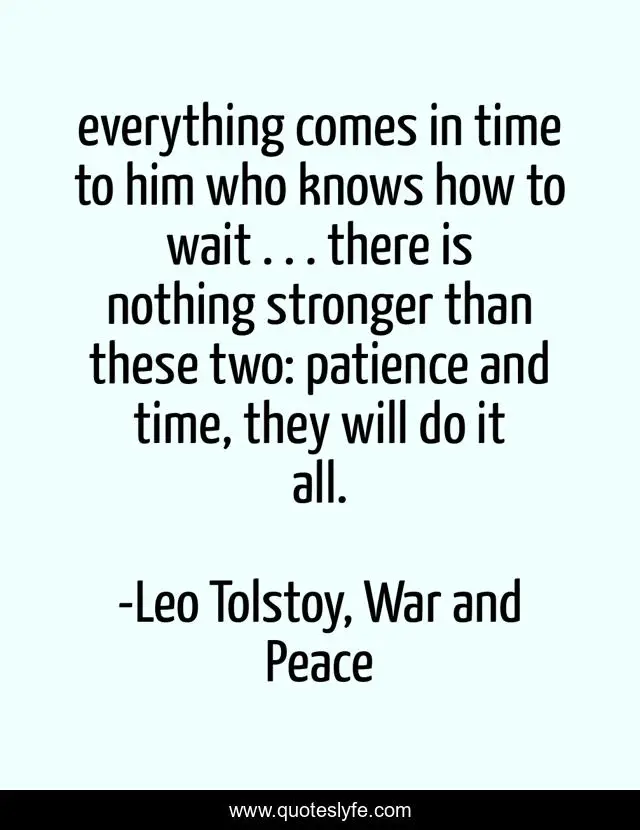 This page presents the quote "everything comes in time to him who knows how to wait . . . there is nothing stronger than these two: patience and time, they will do it all.". Author of this quote is Leo Tolstoy, War and Peace. .