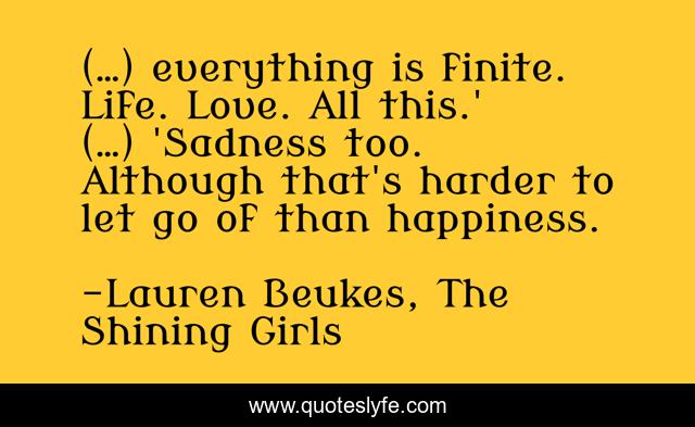 This page presents the quote "(…) everything is finite. Life. Love. All this.' (…) 'Sadness too. Although that's harder to let go of than happiness.". Author of this quote is Lauren Beukes, The Shining Girls. This quote is about happiness, life, love, sadness, affection,.
