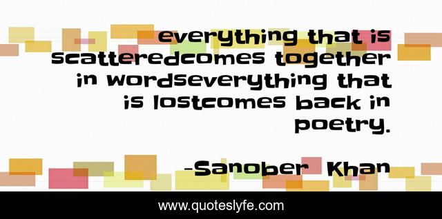 This page presents the quote "everything that is scatteredcomes together in wordseverything that is lostcomes back in poetry.". Author of this quote is Sanober Khan. This quote is about loss, literature, indian-authors, poetry, words, found, poems, inspiration,.