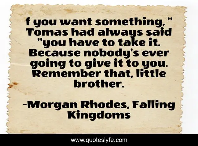 This page presents the quote "f you want something, " Tomas had always said "you have to take it. Because nobody's ever going to give it to you. Remember that, little brother.". Author of this quote is Morgan Rhodes, Falling Kingdoms. This quote is about lessons, life, brothers, brotherhood,.