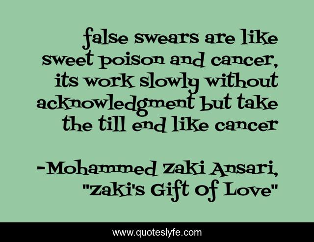 This page presents the quote "false swears are like sweet poison and cancer, its work slowly without acknowledgment but take the till end like cancer". Author of this quote is Mohammed Zaki Ansari, "Zaki's Gift Of Love". This quote is about lies, promises, swears,.