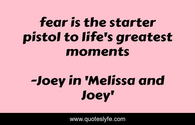 This page presents the quote "fear is the starter pistol to life's greatest moments". Author of this quote is Joey in 'Melissa and Joey'. This quote is about moments, fear, life,.