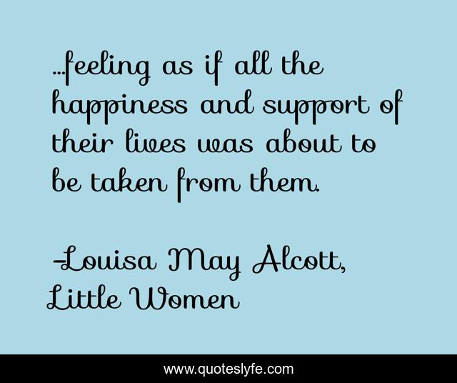 This page presents the quote "…feeling as if all the happiness and support of their lives was about to be taken from them.". Author of this quote is Louisa May Alcott, Little Women. This quote is about little-women, louisa-may-alcott, happiness,.