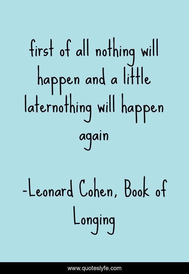 "Leonard Cohen, Book of Longing Quotes." Quoteslyfe.com, 2025. Fri. 05 Dec. 2025. <https://www.quoteslyfe.com/quote/first-of-all-nothing-will-happen-and-24359>.