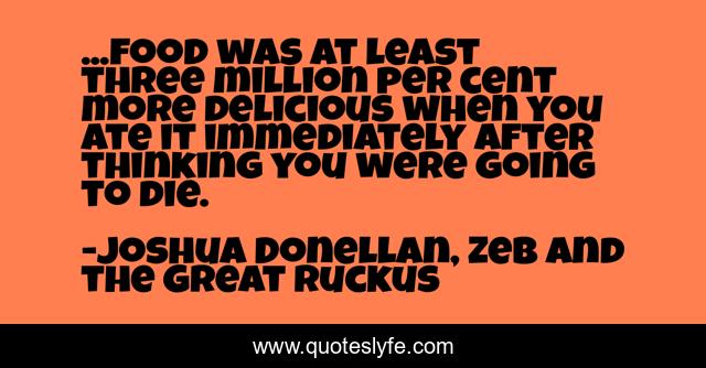 This page presents the quote "...food was at least three million per cent more delicious when you ate it immediately after thinking you were going to die.". Author of this quote is Joshua Donellan, Zeb and the Great Ruckus. This quote is about humorous, humourous, humor, humour,.