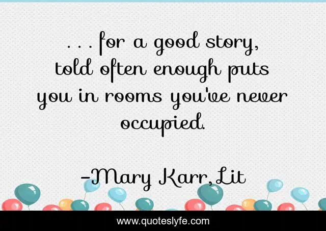 This page presents the quote ". . . for a good story, told often enough puts you in rooms you've never occupied.". Author of this quote is Mary Karr, Lit. .
