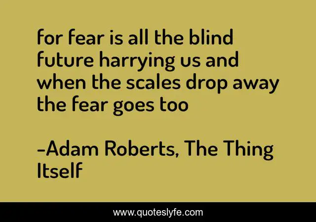 This page presents the quote "for fear is all the blind future harrying us and when the scales drop away the fear goes too". Author of this quote is Adam Roberts, The Thing Itself. This quote is about fearless, fear, future,.