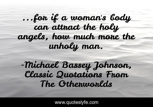 This page presents the quote "...for if a woman's body can attract the holy angels, how much more the unholy man.". Author of this quote is Michael Bassey Johnson, Classic Quotations From The Otherworlds. This quote is about body, holy, angel, beauty, flesh, cars, cosmic, poetry, together,.