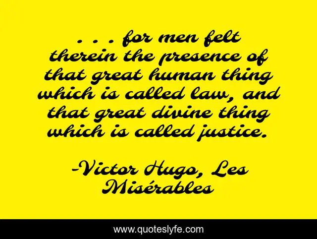This page presents the quote ". . . for men felt therein the presence of that great human thing which is called law, and that great divine thing which is called justice.". Author of this quote is Victor Hugo, Les Misérables. This quote is about justice, law, les-misérables,.