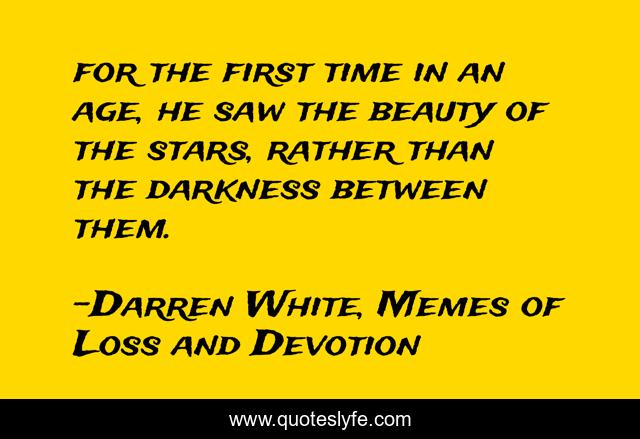 This page presents the quote "for the first time in an age, he saw the beauty of the stars, rather than the darkness between them.". Author of this quote is Darren White, Memes of Loss and Devotion. This quote is about reflief, beauty, hope, stars,.
