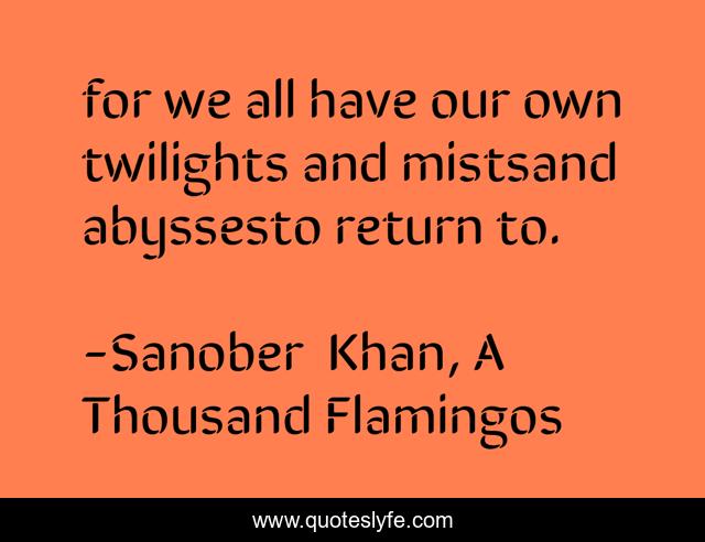 This page presents the quote "for we all have our own twilights and mistsand abyssesto return to.". Author of this quote is Sanober Khan, A Thousand Flamingos. This quote is about abyss, poets, darkness, returning, poetry, dark, sadness, words, mist,.