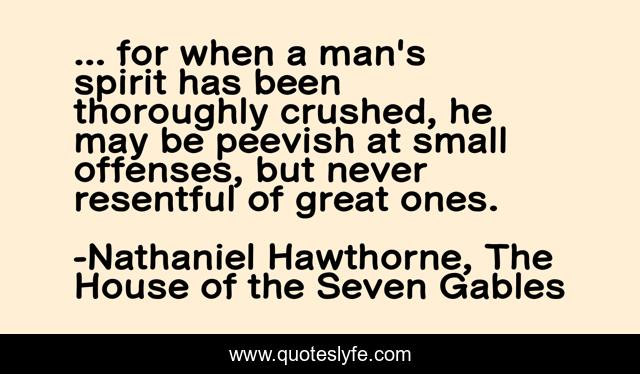 This page presents the quote "... for when a man's spirit has been thoroughly crushed, he may be peevish at small offenses, but never resentful of great ones.". Author of this quote is Nathaniel Hawthorne, The House of the Seven Gables. This quote is about gloom, house-of-the-seven-gables, reaction, men, attitude, behaviour, shame, crushed-spirit, low,.