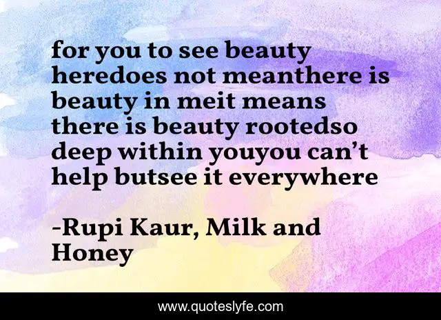 This page presents the quote "for you to see beauty heredoes not meanthere is beauty in meit means there is beauty rootedso deep within youyou can’t help butsee it everywhere". Author of this quote is Rupi Kaur, Milk and Honey. .