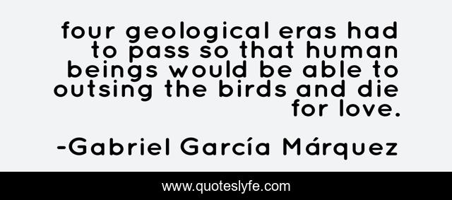 This page presents the quote "four geological eras had to pass so that human beings would be able to outsing the birds and die for love.". Author of this quote is Gabriel García Márquez. This quote is about love, music, affection, song,.