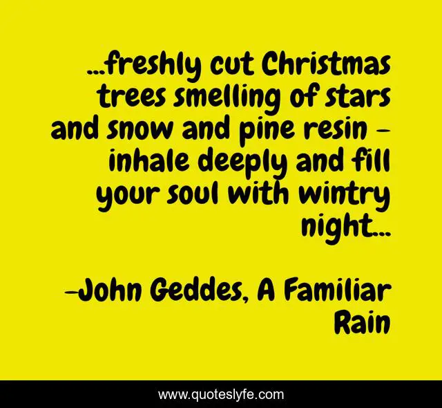 This page presents the quote "...freshly cut Christmas trees smelling of stars and snow and pine resin - inhale deeply and fill your soul with wintry night...". Author of this quote is John Geddes, A Familiar Rain. This quote is about wintry-night, snow, trees, soul, pine, stars, poetry, christmas-tree, christmas,.