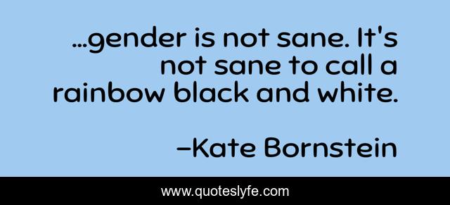 This page presents the quote "…gender is not sane. It's not sane to call a rainbow black and white.". Author of this quote is Kate Bornstein. This quote is about sanity, gender, rainbow,.
