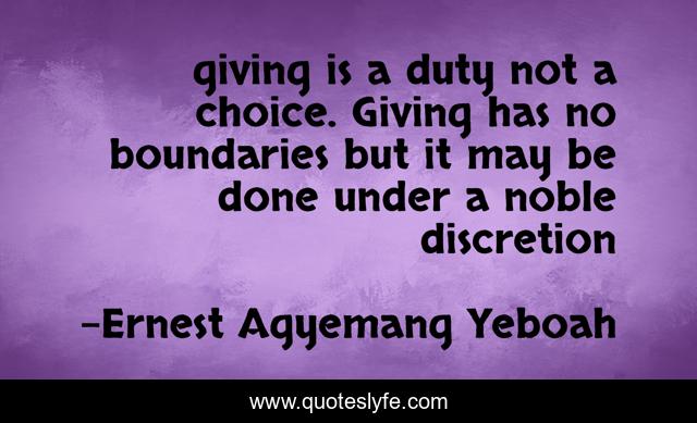 This page presents the quote "giving is a duty not a choice. Giving has no boundaries but it may be done under a noble discretion". Author of this quote is Ernest Agyemang Yeboah. This quote is about duty, life, love, duty-and-attitude, giving, choices-in-life, life-lessons, hatred, giving-your-best,.