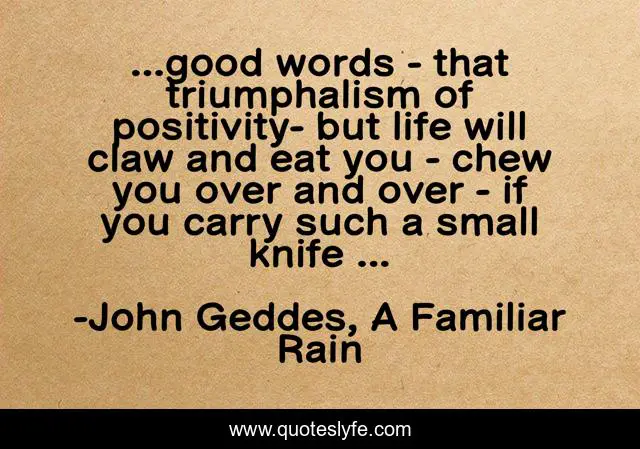 This page presents the quote "...good words - that triumphalism of positivity- but life will claw and eat you - chew you over and over - if you carry such a small knife ...". Author of this quote is John Geddes, A Familiar Rain. This quote is about life, triumphalism, wisdom, words, tools, knife,.