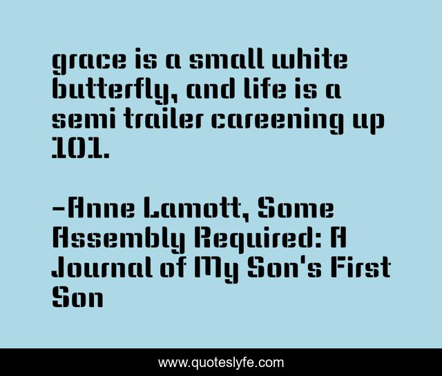 This page presents the quote "grace is a small white butterfly, and life is a semi trailer careening up 101.". Author of this quote is Anne Lamott, Some Assembly Required: A Journal of My Son's First Son. This quote is about life, grace,.