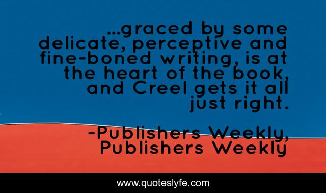 This page presents the quote "...graced by some delicate, perceptive and fine-boned writing, is at the heart of the book, and Creel gets it all just right.". Author of this quote is Publishers Weekly, Publishers Weekly. This quote is about historical, love-story,.