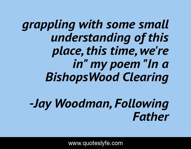 This page presents the quote "grappling with some small understanding of this place, this time, we're in" my poem "In a BishopsWood Clearing". Author of this quote is Jay Woodman, Following Father. This quote is about poem, woods, children, understanding,.