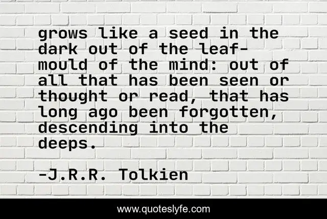 This page presents the quote "grows like a seed in the dark out of the leaf-mould of the mind: out of all that has been seen or thought or read, that has long ago been forgotten, descending into the deeps.". Author of this quote is J.R.R. Tolkien. This quote is about writing-craft, writing,.