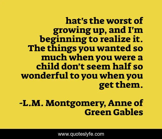 This page presents the quote "hat's the worst of growing up, and I'm beginning to realize it. The things you wanted so much when you were a child don't seem half so wonderful to you when you get them.". Author of this quote is L.M. Montgomery, Anne of Green Gables. .