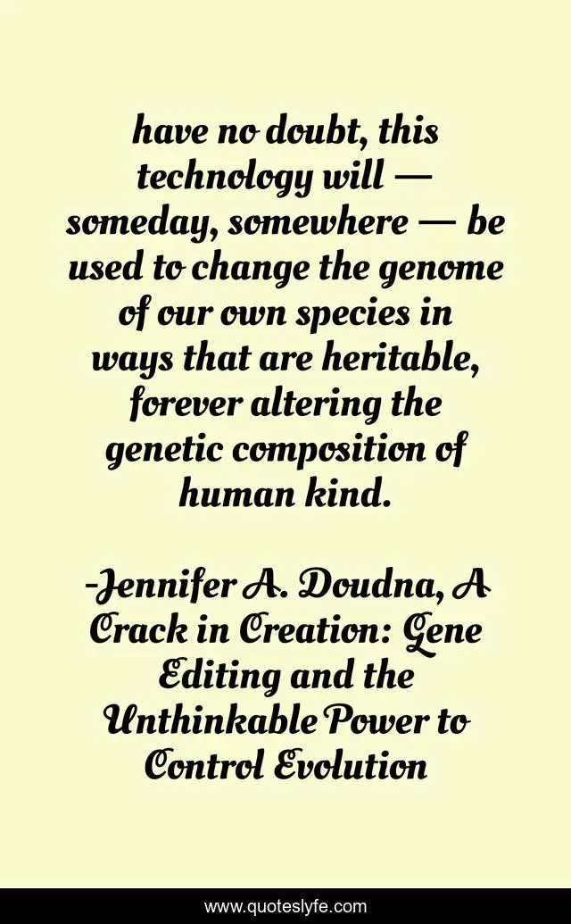 "Jennifer A. Doudna, A Crack in Creation: Gene Editing and the Unthinkable Power to Control Evolution Quotes." Quoteslyfe.com, 2025. Mon. 08 Dec. 2025. <https://www.quoteslyfe.com/quote/have-no-doubt-this-technology-will-someday-178166>.