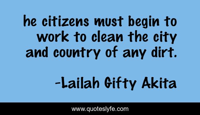 This page presents the quote "he citizens must begin to work to clean the city and country of any dirt.". Author of this quote is Lailah Gifty Akita. This quote is about inspiring-words, citizens, community-service, advice, work, clean-environment, environmental-degradation,.
