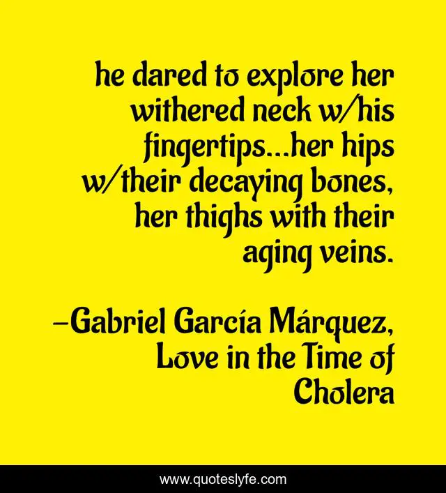 This page presents the quote "he dared to explore her withered neck w/his fingertips…her hips w/their decaying bones, her thighs with their aging veins.". Author of this quote is Gabriel García Márquez, Love in the Time of Cholera. This quote is about lust, aging, love, affection,.