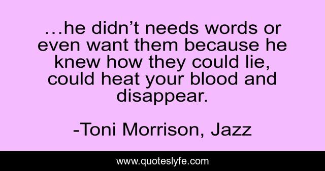 This page presents the quote "…he didn’t needs words or even want them because he knew how they could lie, could heat your blood and disappear.". Author of this quote is Toni Morrison, Jazz. This quote is about lies, jazz, silence, words, toni-morrison,.