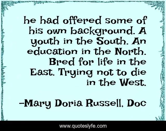 This page presents the quote "he had offered some of his own background. A youth in the South. An education in the North. Bred for life in the East. Trying not to die in the West.". Author of this quote is Mary Doria Russell, Doc. This quote is about american-west, western, mortality,.