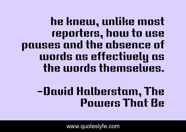 This page presents the quote "he knew, unlike most reporters, how to use pauses and the absence of words as effectively as the words themselves.". Author of this quote is David Halberstam, The Powers That Be. This quote is about communication, rhetoric,.