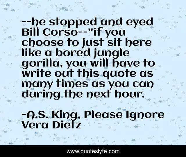 This page presents the quote "--he stopped and eyed Bill Corso--"if you choose to just sit here like a bored jungle gorilla, you will have to write out this quote as many times as you can during the next hour.". Author of this quote is A.S. King, Please Ignore Vera Dietz. This quote is about humorous, detention,.