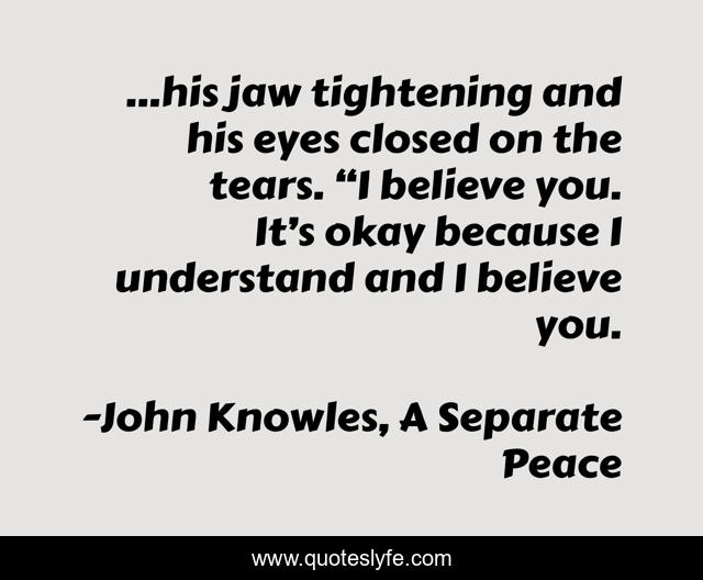 This page presents the quote "...his jaw tightening and his eyes closed on the tears. “I believe you. It’s okay because I understand and I believe you.". Author of this quote is John Knowles, A Separate Peace. This quote is about jealousy, acceptance, betrayal, sad, understanding, friendship,.