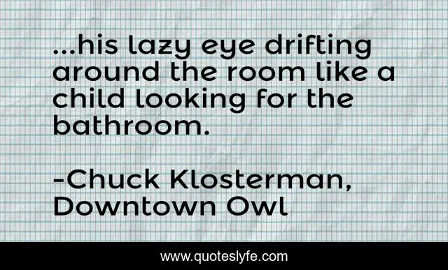 This page presents the quote "...his lazy eye drifting around the room like a child looking for the bathroom.". Author of this quote is Chuck Klosterman, Downtown Owl. This quote is about bathroom, klosterman, lazy-eye, child,.