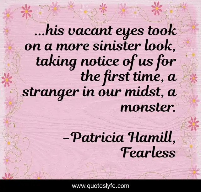 This page presents the quote "...his vacant eyes took on a more sinister look, taking notice of us for the first time, a stranger in our midst, a monster.". Author of this quote is Patricia Hamill, Fearless. .