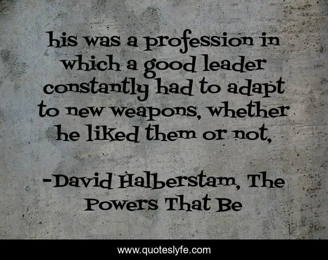 This page presents the quote "his was a profession in which a good leader constantly had to adapt to new weapons, whether he liked them or not, ". Author of this quote is David Halberstam, The Powers That Be. This quote is about openness, leadership, strategy,.