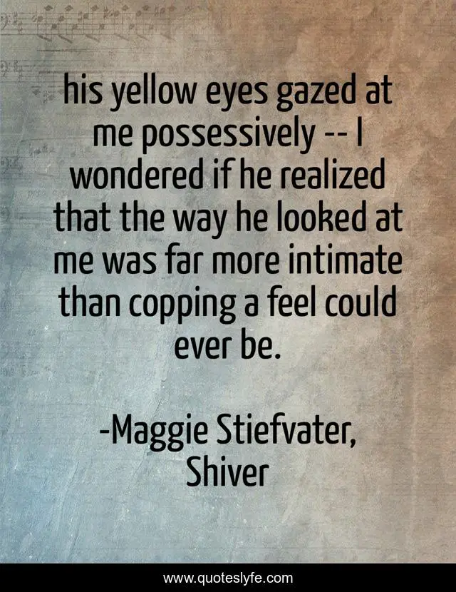 This page presents the quote "his yellow eyes gazed at me possessively -- I wondered if he realized that the way he looked at me was far more intimate than copping a feel could ever be.". Author of this quote is Maggie Stiefvater, Shiver. This quote is about romance, intimacy, shiver, love, affection,.
