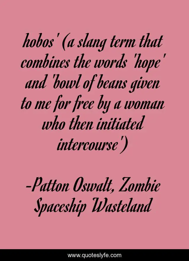 This page presents the quote "hobos' (a slang term that combines the words 'hope' and 'bowl of beans given to me for free by a woman who then initiated intercourse')". Author of this quote is Patton Oswalt, Zombie Spaceship Wasteland. This quote is about humor, satire,.
