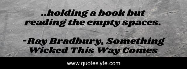 This page presents the quote "..holding a book but reading the empty spaces.". Author of this quote is Ray Bradbury, Something Wicked This Way Comes. This quote is about something-wicked-this-way-comes, book, reading,.