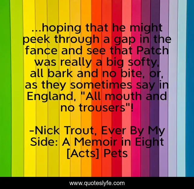 This page presents the quote "...hoping that he might peek through a gap in the fance and see that Patch was really a big softy, all bark and no bite, or, as they sometimes say in England, "All mouth and no trousers"!". Author of this quote is Nick Trout, Ever By My Side: A Memoir in Eight [Acts] Pets. .