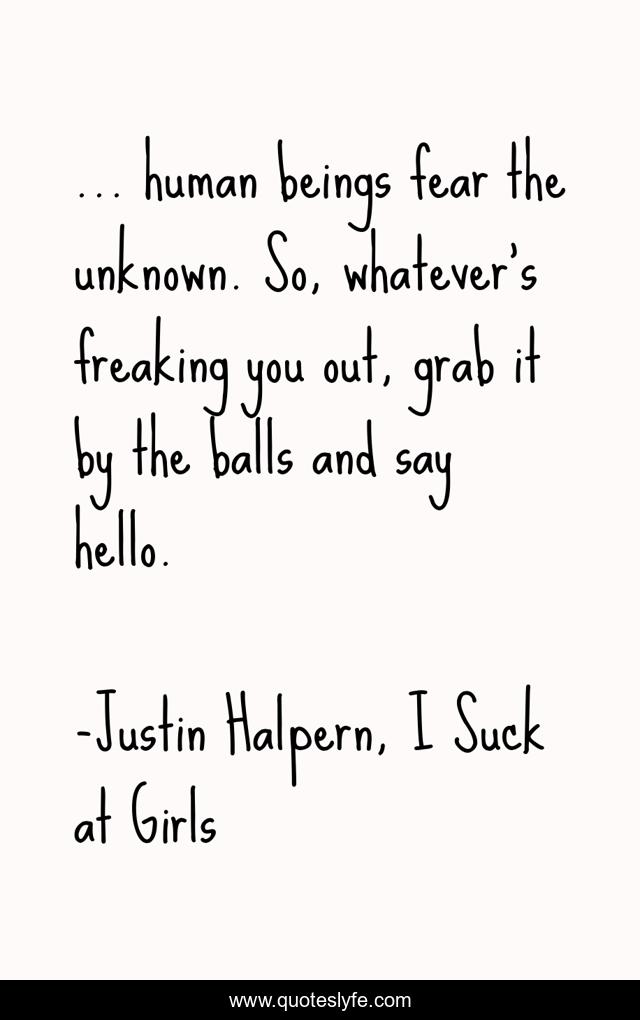 This page presents the quote "... human beings fear the unknown. So, whatever's freaking you out, grab it by the balls and say hello.". Author of this quote is Justin Halpern, I Suck at Girls. This quote is about humor, inspiration,.