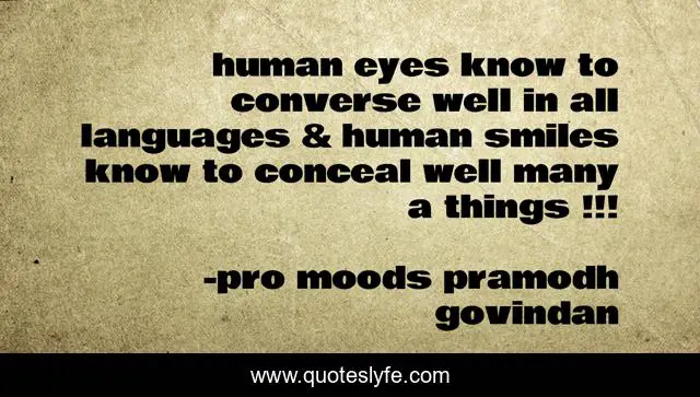 This page presents the quote "human eyes know to converse well in all languages & human smiles know to conceal well many a things !!!". Author of this quote is pro moods pramodh govindan. This quote is about smile, happiness,.