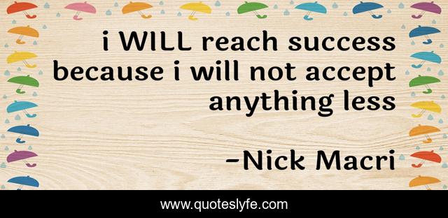 This page presents the quote "i WILL reach success because i will not accept anything less". Author of this quote is Nick Macri. This quote is about confidence, success, positive, motivational, entrepreneur, optimistic, inspirational, enthusiasm,.