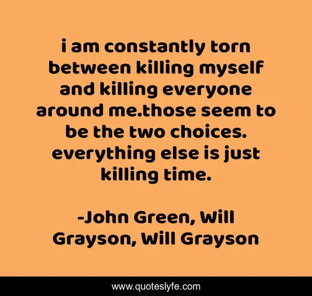 This page presents the quote "i am constantly torn between killing myself and killing everyone around me.those seem to be the two choices. everything else is just killing time.". Author of this quote is John Green, Will Grayson, Will Grayson. This quote is about grudge, hatred, depression,.