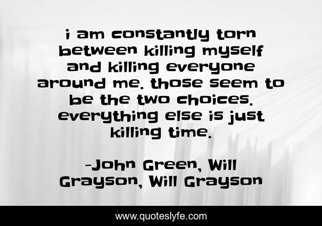 This page presents the quote "i am constantly torn between killing myself and killing everyone around me. those seem to be the two choices. everything else is just killing time.". Author of this quote is John Green, Will Grayson, Will Grayson. This quote is about grudge, hatred, depression,.