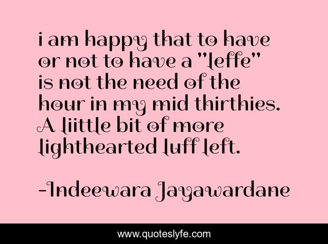 This page presents the quote "i am happy that to have or not to have a "leffe" is not the need of the hour in my mid thirthies. A liittle bit of more lighthearted luff left.". Author of this quote is Indeewara Jayawardane. This quote is about life, marriage, children, mid-thirties,.